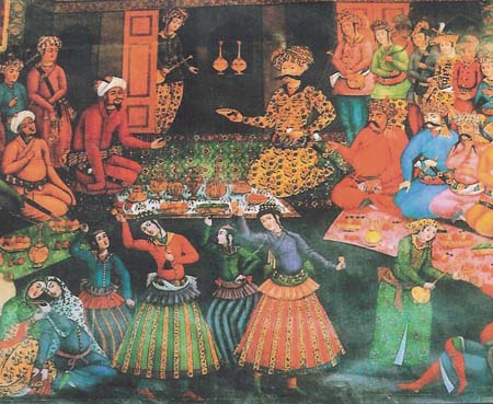 courtiers being entertained by dancers while enjoying wine. The Safavids,